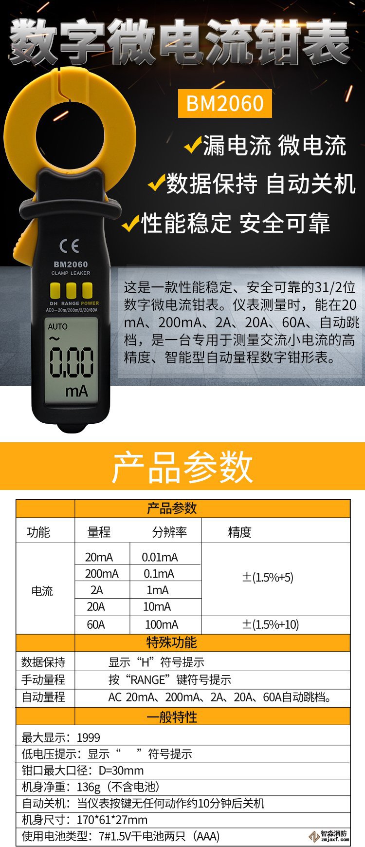 量程:0A~2A;精度:0.1mA測量電線是否漏電。