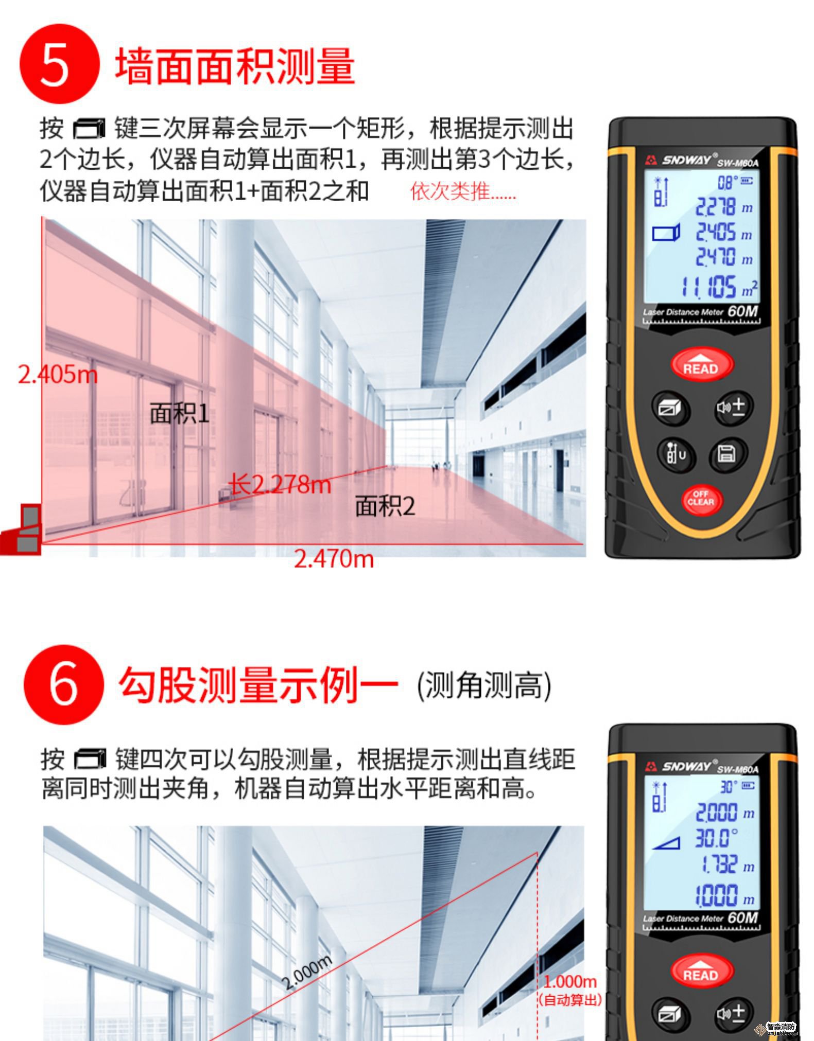 按“面積”鍵,顯示面積顯示符號;按“測量”鍵,測量第一個距離;按“測量”鍵,測量第二個距離;該設備在總計行顯示結果,并在第二行顯示下一個測量值分別測量的距離。
