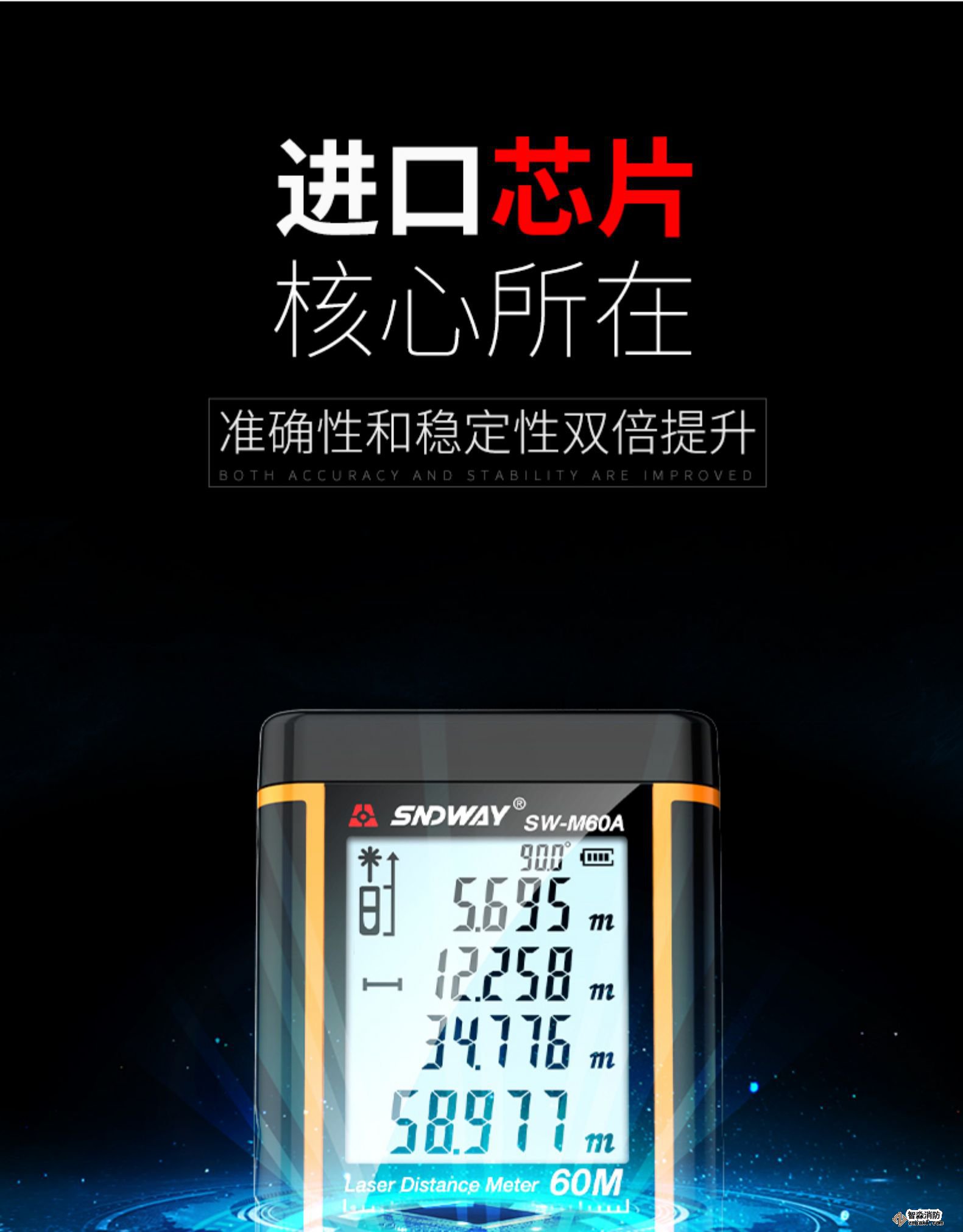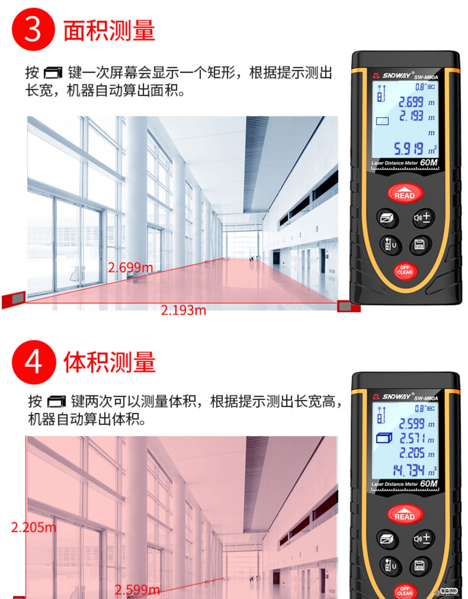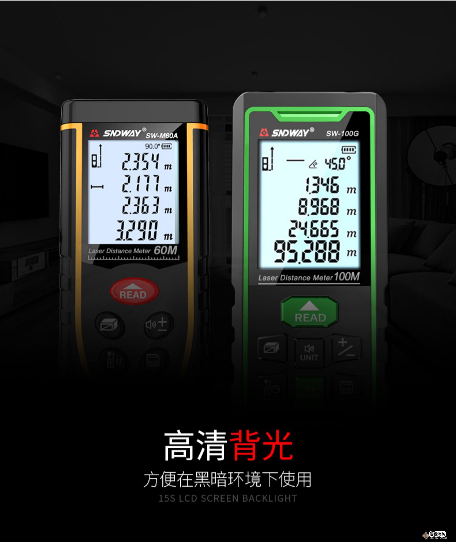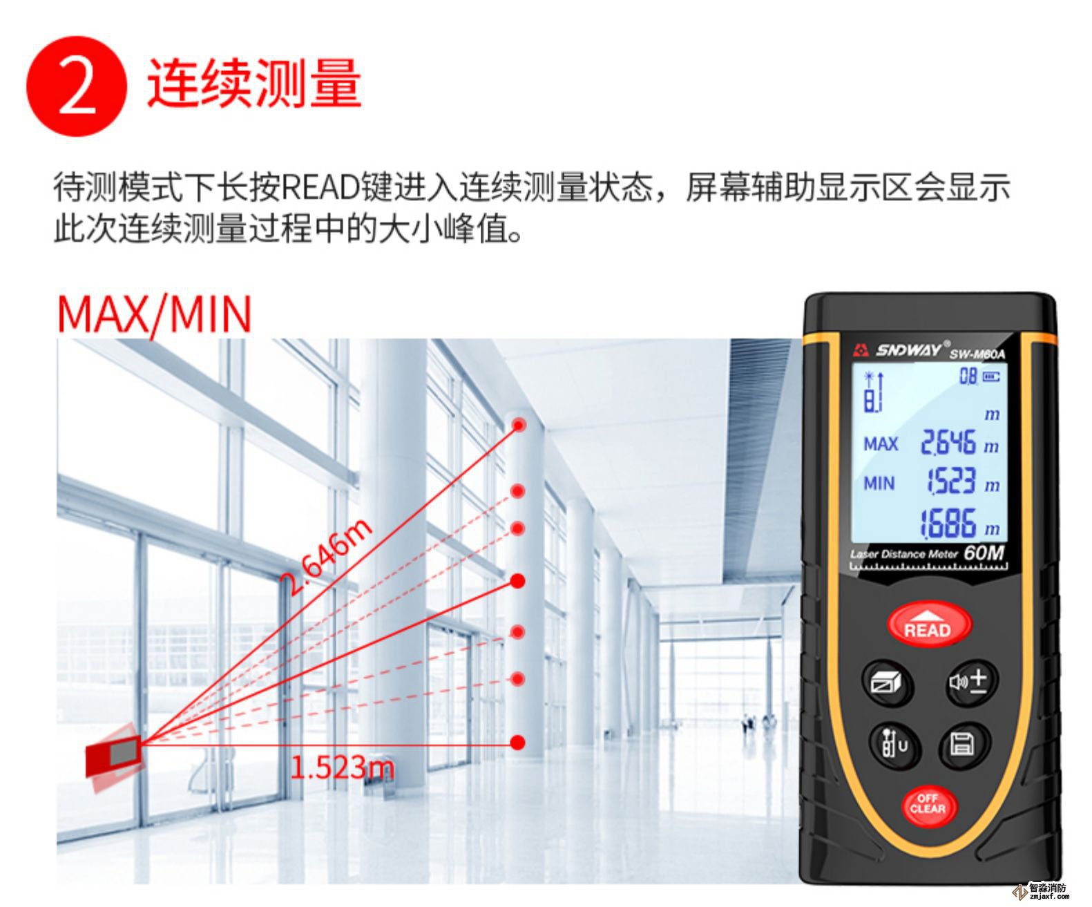 將激活的激光瞄準目標區域;輕按“測量”鍵;設置測量距離。設備立即顯示結果。