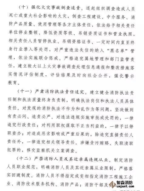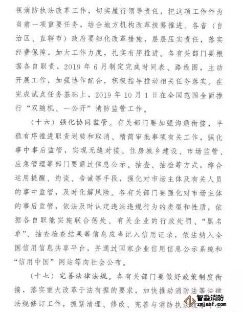 在加強事中事后監管方面,實行“雙隨機、一公開”監管,明確抽查范圍、抽查事項和抽查細則,合理確定抽查比例和頻次;針對火災多發頻發的行業和領域,適時開展集中專項整治,對隱患突出、有嚴重違法違規記錄的單位,實施重點監管;建立消防舉報投訴獎勵制度,鼓勵群眾參與監督;將消防違法違規行為記入信用記錄,嚴重違法失信企業納入“黑名單”管理,依法實施聯合懲戒;完善“互聯網+監管”,運用物聯網和大數據技術,實時化、智能化評估消防安全風險,實現精準監管;強化火災事故倒查追責,逐起組織調查造成人員死亡或造成重大社會影響的火災,倒查工程建設、中介服務、消防產品質量、使用管理等各方主體責任,嚴肅責任追究。