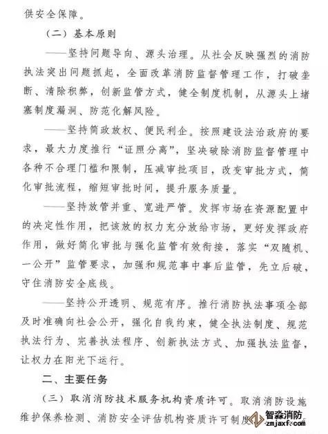 《意見》明確,消防執法改革要堅持問題導向、源頭治理,從社會反映強烈的消防執法突出問題抓起,全面改革消防監督管理工作,從源頭上堵塞制度漏洞、防范化解風險;堅持簡政放權、便民利企,最大力度推行“證照分離”,堅決破除消防監督管理中各種不合理門檻和限制,提升服務質量;堅持放管并重、寬進嚴管,把該放的權力充分放給市場,做好簡化審批和強化監管有效銜接,加強和規范事中事后監管,守住消防安全底線;堅持公開透明、規范有序,健全執法制度、規范執法行為、完善執法程序、創新執法方式、加強執法監督,讓權力在陽光下運行。同時,提出了消防執法改革5個方面12項主要任務。