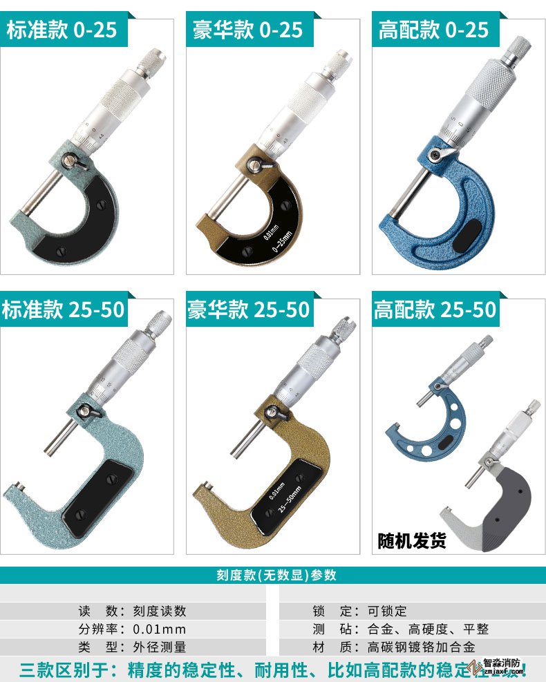 數顯千分尺分度值可達0.001的層級,實為微米千分尺。普通不帶數顯的千分尺分度值為0.01,可稱為普通千分尺也可以稱之為百分尺。